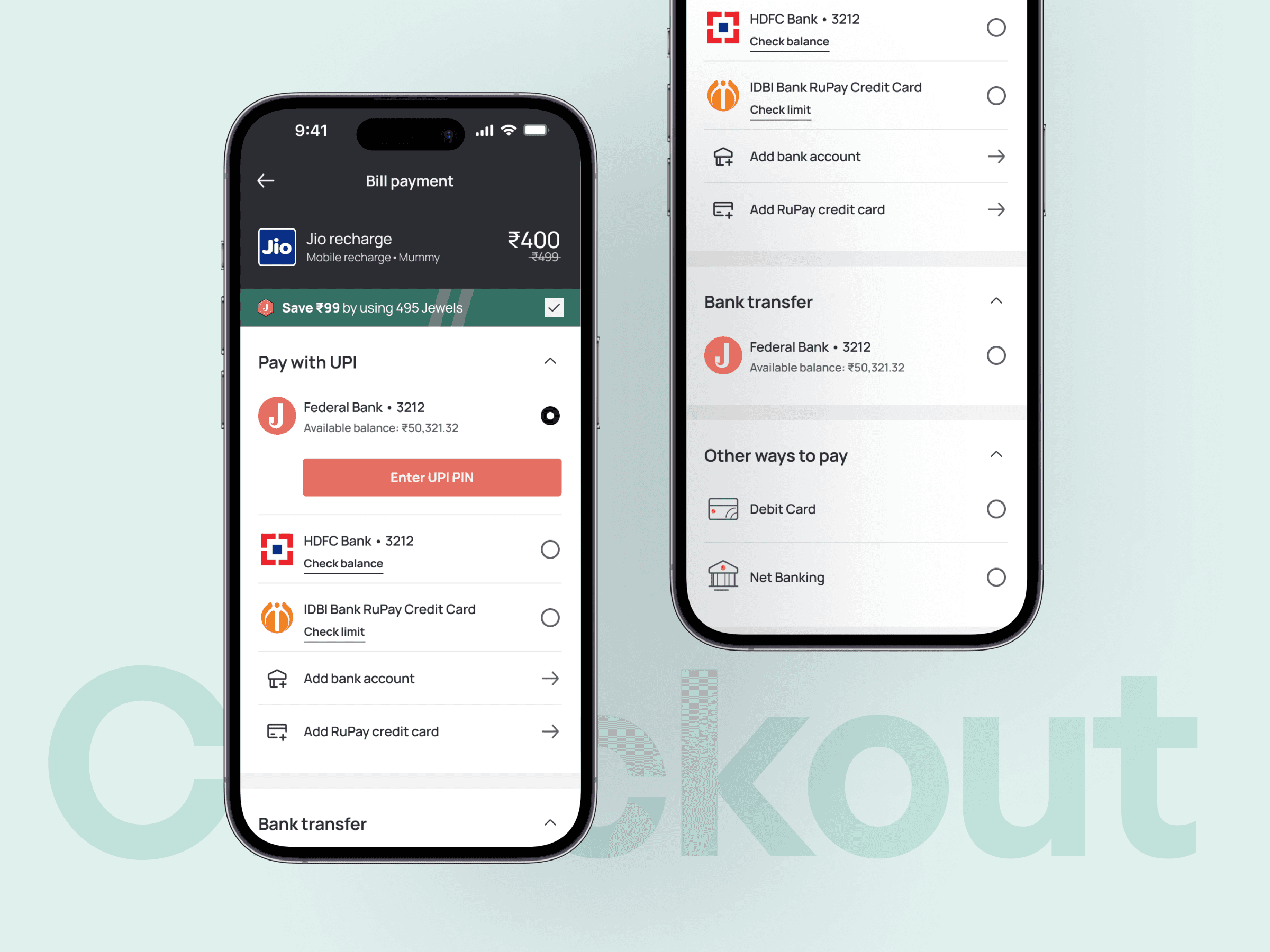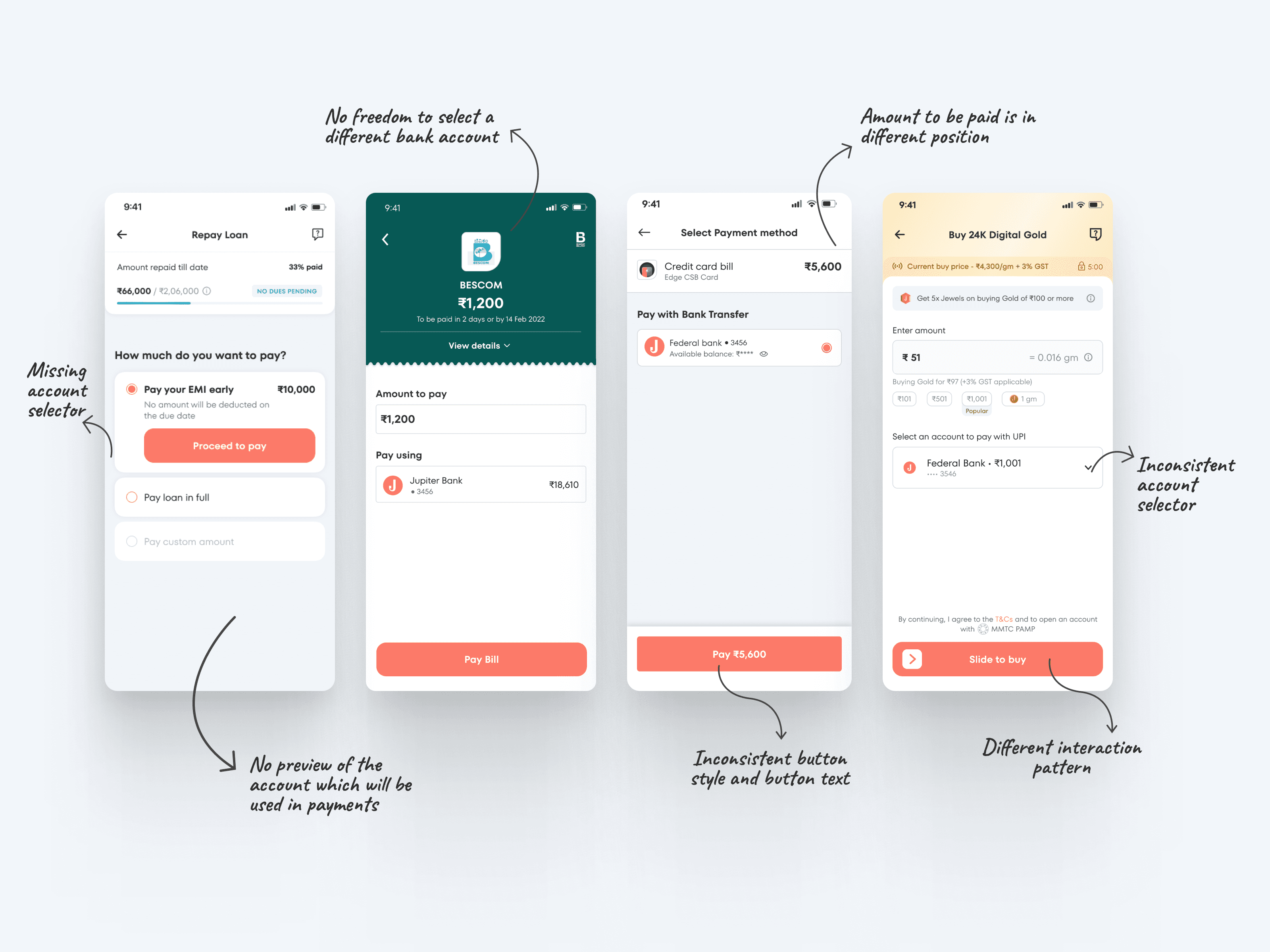Jupiter handled dozens of payment journeys bill payments, EMIs, credit card dues, gold purchases, recharges, and more but each one used a completely different checkout layout. Amount fields behaved differently, UPI selection changed across screens, CTAs moved, and error states lacked consistency. This fragmentation increased cognitive load, broke trust, and made a core money action feel unpredictable.